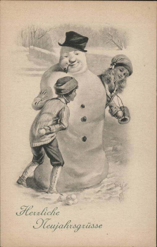 A vintage New Year's postcard features two children, a boy and a girl, building a large snowman. The snowman sports a top hat and a pipe, adding a touch of whimsy. The children are bundled in winter clothing, and snowballs lie scattered around their feet. The scene is set against a snowy backdrop, with bare trees in the distance. The German phrase "Herzliche Neujahrsgrüsse" (Hearty New Year's greetings) is inscribed at the bottom.