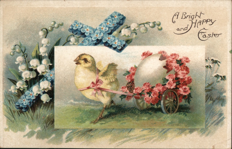 A charming Easter postcard featuring a fluffy yellow chick pulling a cart adorned with pink roses. The cart carries a large white egg, also decorated with roses. The background showcases a cross made of forget-me-nots and a cluster of lily of the valley. The chick wears a pink ribbon tied around its chest. The scene is framed by a decorative border. |