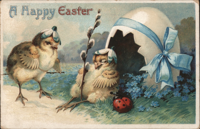 | Two adorable chicks, one wearing a green bonnet and holding a pussy willow branch, sit beside a cracked eggshell tied with a blue ribbon. A ladybug rests nearby in a patch of forget-me-nots. The background features a grassy field. The words "A Happy Easter" appear at the top of the card. |