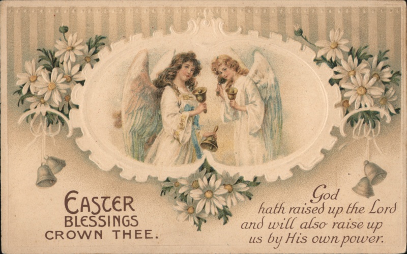| Two angels, adorned in flowing white robes, hold bells in a decorative oval frame. The border is embellished with daisies and small bells. The text reads, "EASTER BLESSINGS CROWN THEE." and "God hath raised up the Lord and will also raise up us by His own power." |