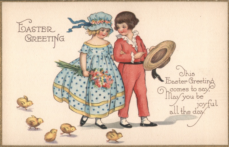 | Two children, a girl in a blue polka dot dress and a boy in a red suit, stand with a group of chicks. The girl holds a bouquet of flowers, and the boy holds a straw hat. The text "Easter Greeting" appears at the top left, and a verse reads, "This Easter Greeting comes to say, May you be joyful all the day." |