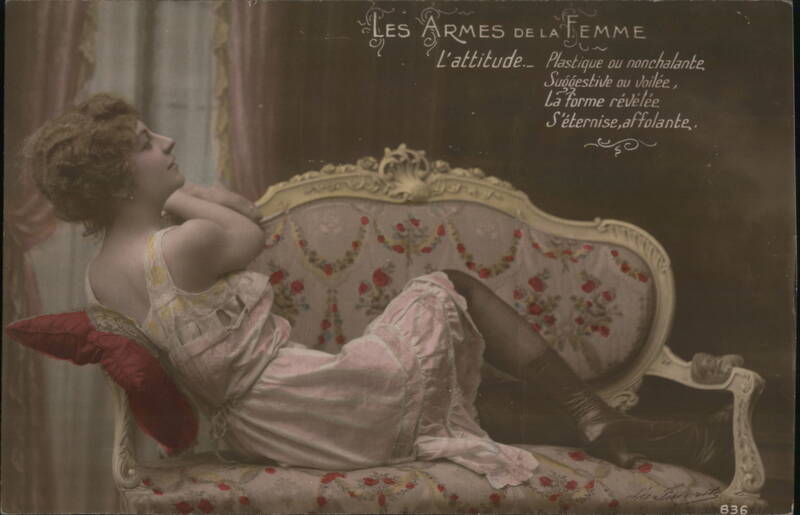 Vintage postcard featuring a woman in a sheer, light-colored lingerie or nightgown, reclining on an ornate chaise lounge. The chaise lounge has a floral upholstery, and the woman's pose is suggestive. The postcard is titled "Les Armes de la Femme. L'Attitude..." followed by a descriptive French text about her pose. |