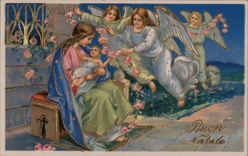 | A vintage Christmas postcard featuring the Madonna cradling the baby Jesus, surrounded by three angels showering them with pink roses. The scene is set against a backdrop of a stone wall and a decorative gate, with a "Buon Natale" greeting at the bottom right. |