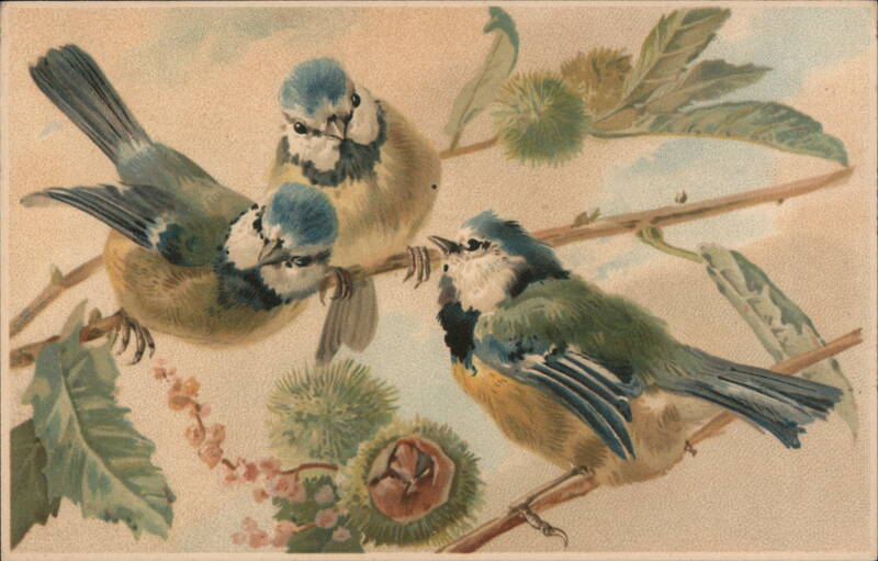 Trio of Blue Tit Birds Perched on Chestnut Branches