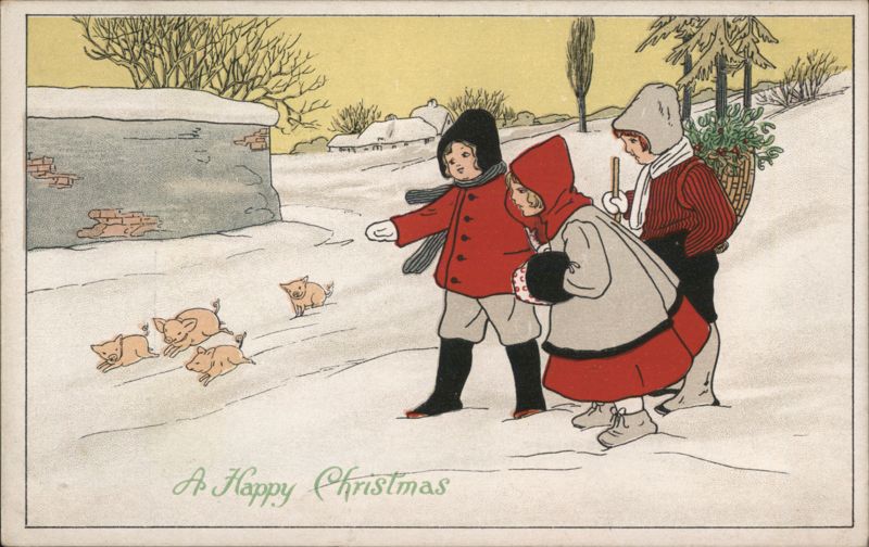 | Three children, two bundled in winter clothing and one carrying a basket with holly, watch three piglets running in the snow. A stone wall, houses, and trees are visible in the background. The phrase "A Happy Christmas" is written in the bottom left corner. |