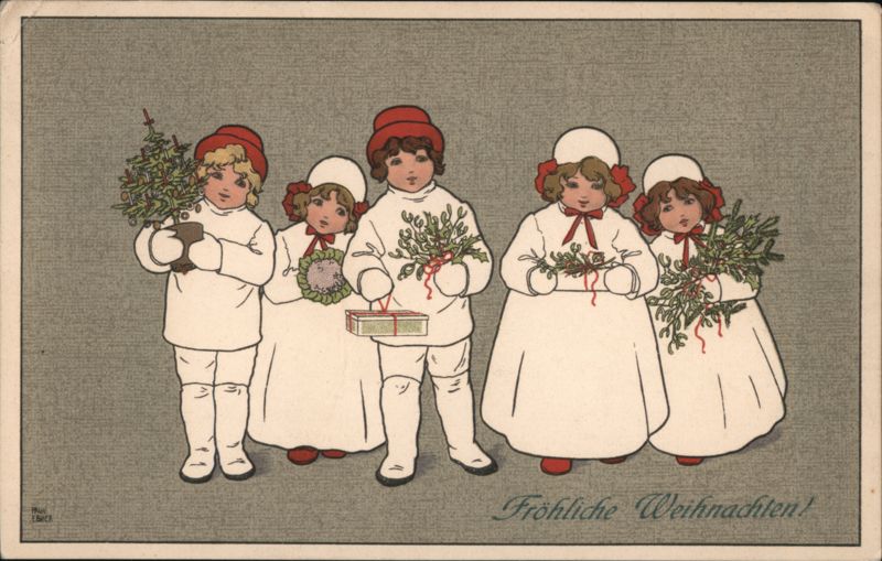 | Five children, dressed in white robes and red hats or bonnets, stand together holding various Christmas decorations. Two girls on the right hold sprigs of mistletoe or holly. A boy in the center holds a small wrapped gift, while a girl next to him holds a small wreath. The boy on the left holds a small potted Christmas tree decorated with ornaments. The background is a muted grayish-green. "Fröhliche Weihnachten!" (Merry Christmas!) is written in the bottom right corner. |