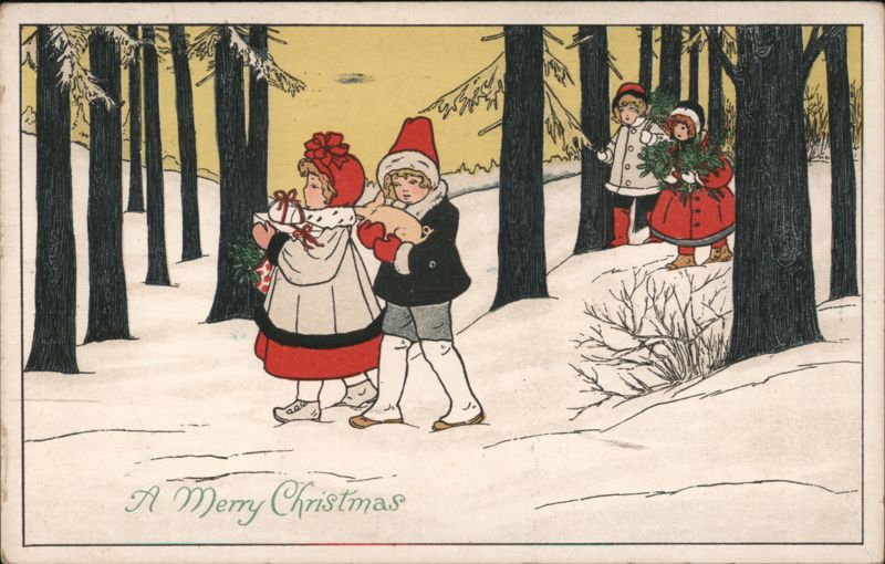 Four children are depicted in a snowy forest, two in the foreground and two further back. The children in the front are a girl wearing a red and white outfit and bonnet, and a boy in a white, fur-trimmed hat and dark coat. They each carry small evergreen branches decorated with red bows. In the background, two more children, a boy and a girl, are also carrying evergreen branches. The postcard has a simple "A Merry Christmas" message at the bottom. |