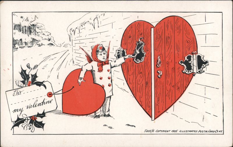 A cherubic child, dressed in a red and white outfit with heart-shaped wings, stands before a large, heart-shaped red door built into a stone wall. The child holds a large red heart and reaches for the door handle. A gift tag labeled "To my valentine" with holly sprigs hangs in the bottom left corner. A snowy path and building are visible in the background. |