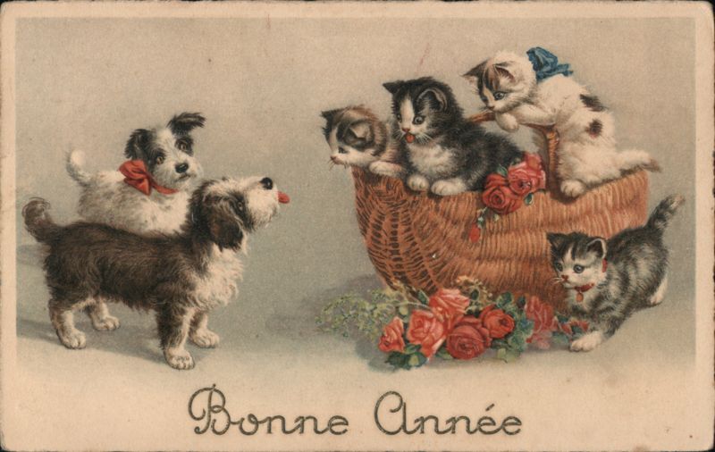 Two adorable dogs, one with a red bow tie and the other with a pink bow, gaze curiously at a basket overflowing with playful kittens. One adventurous kitten perches on the basket's edge, while another peeks out from behind the roses adorning the handle. The scene is set against a soft, muted backdrop, and the phrase "Bonne Année" (Happy New Year) is inscribed at the bottom, suggesting a New Year's greeting. |