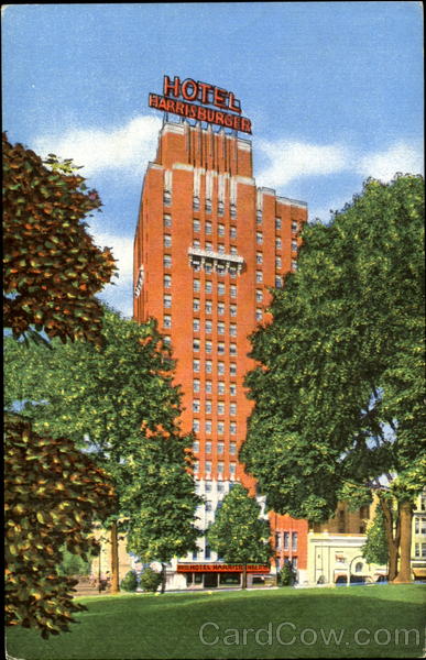 Front: HOTFEL HARRISBURGER HOTEL HARRISB RGER Back: 9214 C. THE HARRIS BURGER Harrisburg's Newest and Tallest Hotel Overlooking the Beautiful Capitol Park Direction American Hotels Corporation HARRISBURG, PENNSYLVANIA co