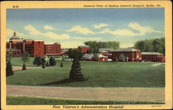 Front: B-94 General View of Deshon General Hospital, Butler, Pa. Now Veteran's Administration Hospital 4B-HI167 Back: MINSKY BROS. & co., PUBLISHING DIVISION, PITTSBURGH, PA. "C.T.ART-COLORTONE'' REG. U.S. PAT. OFF.