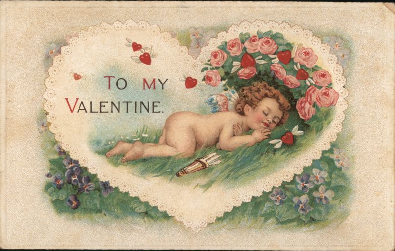 A Valentine's Day postcard featuring a sleeping Cupid lying on a bed of grass within a heart-shaped frame adorned with pink roses and small purple flowers. Cupid's quiver and arrow lie beside him, and small red hearts flutter around. The message "To My Valentine" is written above Cupid. |