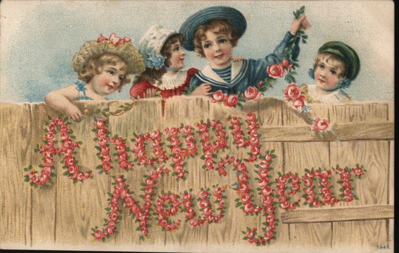 | Four children, two girls and two boys, peer over a wooden fence decorated with red roses forming the phrase "A Happy New Year." One child wears a sailor suit, another a straw hat, and the girls wear bonnets. One child hangs a garland of roses on the fence. |
