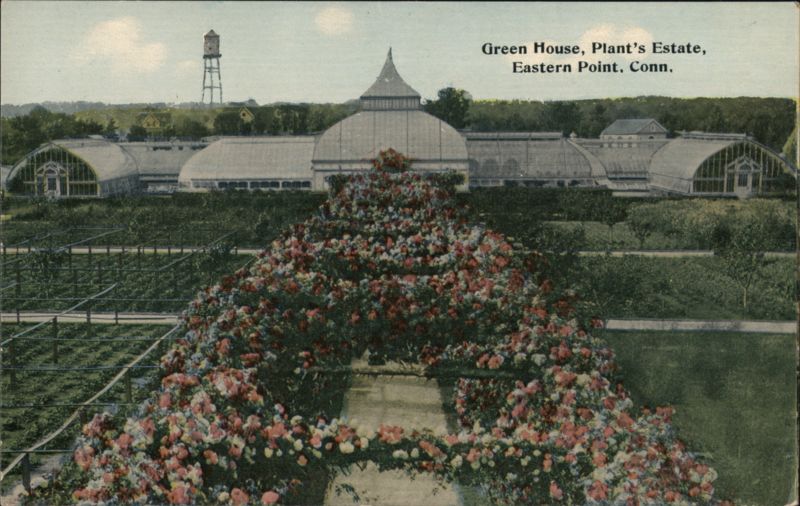 A vibrant postcard showcasing Plant's Greenhouse at Eastern Point, Connecticut. A meticulously arranged floral display in a triangular pattern dominates the foreground, leading the eye towards the impressive glass structure of the greenhouse. Additional greenhouse wings extend to either side of the main building, and rows of plants are visible in the background. A water tower can be seen in the distance. |