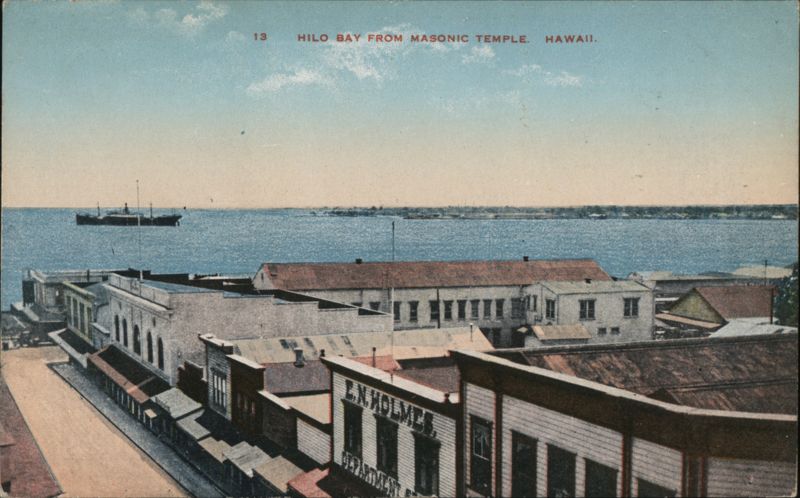 | A panoramic view of Hilo Bay from the Masonic Temple in Hilo, Hawaii. The postcard captures the crescent shape of the bay with Coconut Island visible in the background. The foreground features the rooftops of buildings lining the street, with the ocean and a steamship in the distance. |