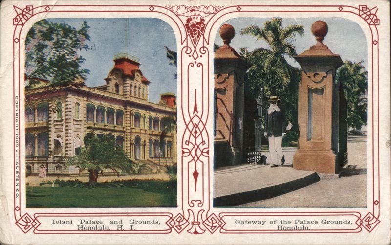 | A divided back postcard featuring two images of Iolani Palace in Honolulu. The left image showcases the palace's exterior with its distinctive architecture and landscaped grounds. The right image highlights the ornate gateway to the palace grounds, with a man standing near the entrance. |