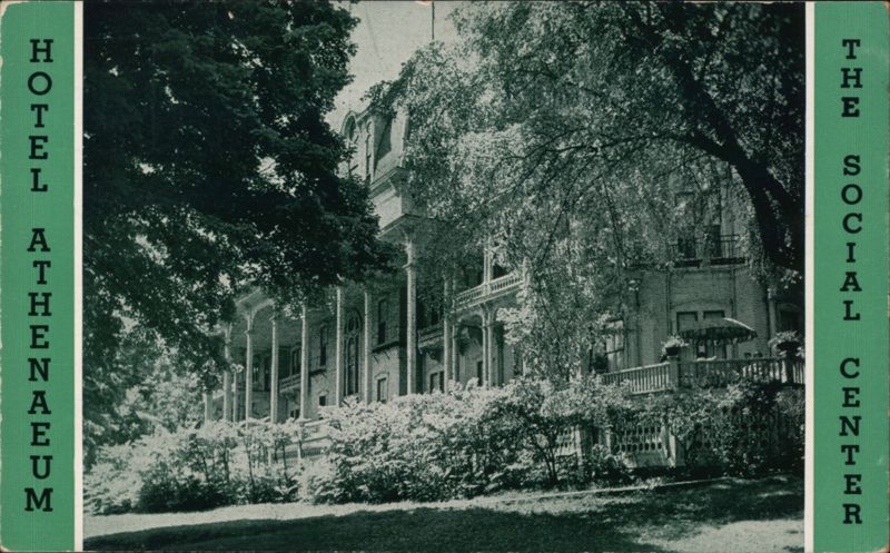 A view of the Hotel Athenaeum at the Chautauqua Institution in Chautauqua, New York. The hotel, a grand white building with columns and a porch, stands amidst lush greenery. Trees and bushes frame the building, creating a serene and inviting atmosphere. |