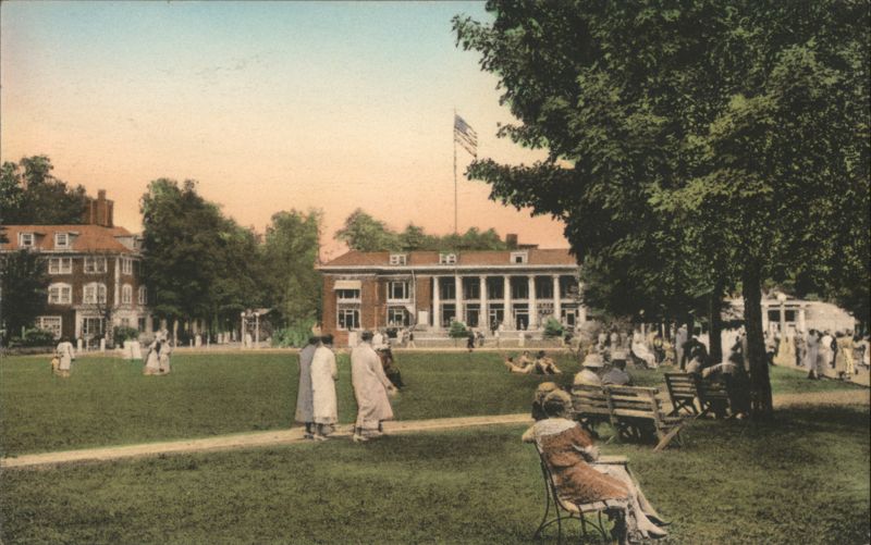 People relax and stroll across the grassy plaza at the Chautauqua Institution. Benches provide seating under a shade tree at right, while others enjoy the open green space. The columned facade of the Chautauqua Institution building is visible in the background, with an American flag flying proudly. Brick buildings can be seen to the left. |
