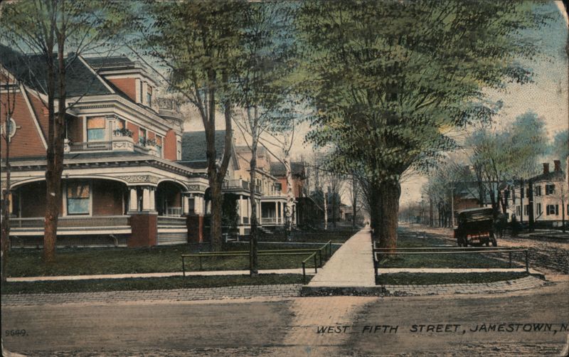 Divided back postcard showcasing a picturesque view of West Fifth Street in Jamestown, NY. The image captures a row of elegant houses, a paved sidewalk, and a vintage automobile in the distance. Lush trees line the street, adding to the scene's charm. |