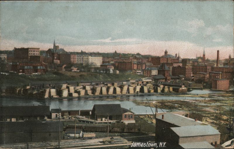 A panoramic view of Jamestown, New York, featuring a prominent lumber yard in the foreground. Stacks of lumber line the riverbank, with industrial buildings and rail lines nearby. The cityscape of Jamestown rises in the background, showcasing a mix of residential and commercial structures. |