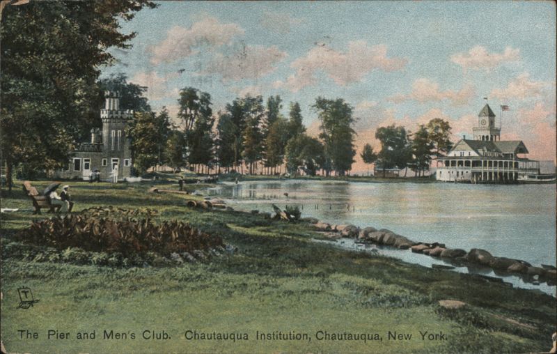 | A picturesque view of the Chautauqua Institution's pier and Men's Club. The scene showcases the tranquil waterfront with a two-story building featuring a clock tower and an American flag. A smaller, castle-like structure is visible on the grassy shore, where a man sits on a bench. Trees line the edge of the water, and rocks and greenery are present along the shoreline. |
