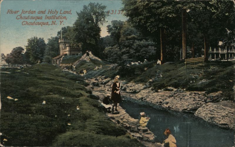| A colorized photo postcard depicting the River Jordan and Holy Land model at the Chautauqua Institution in Chautauqua, New York. Several adults and children are visible near the river model, and a stone tower structure is visible on the left side of the image. Lush green grass and trees surround the scene. |