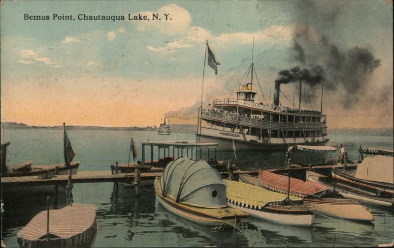 | A colorized photo postcard depicting a steamboat docked at Bemus Point on Chautauqua Lake, New York. Several smaller rowboats and other vessels are tied up at the dock in the foreground. The steamboat has a tall smokestack emitting dark smoke, suggesting it is actively running. People can be seen on the decks of the steamboat. The smaller boats in the foreground exhibit a variety of colors and some have canvas canopies. The lake and sky form a serene backdrop, with the suggestion of hills or mountains in the distance. |