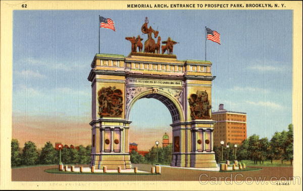 | The Memorial Arch stands in the enter of the plaza at the entrance to Prospect Park. This arch, a memorial to the soldiers and sailors of the Civil War, is surmounted by a colossal bronze group by Frederick Mac Monnies, representing the chariot of victory led by heralds of Peace. |
