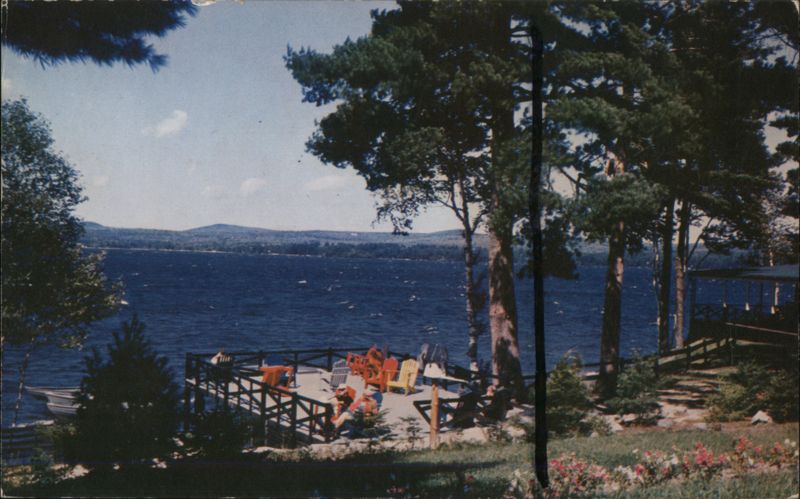| A scenic view of Lake Wentworth from the sun deck at Point Breeze in Wolfeboro, New Hampshire. Several people are relaxing in colorful Adirondack chairs on the deck, enjoying the view of the lake and distant mountains. Pine trees frame the scene, and a glimpse of a building with a porch is visible on the right. A small dock extends into the lake on the left, with a small boat tied to it. The lake's surface is slightly choppy, with small waves visible. Flowers and grass are visible in the foreground. |