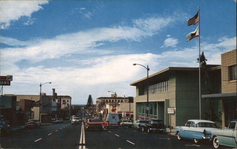 | A view of Main Street in Ventura, California, looking westward towards the Pacific Ocean. The Ventura County Library is visible in the foreground on the right side of the image. Various cars from the 1950s and 1960s are parked or driving along the street. An American flag and the California state flag are flying from a flagpole on the right. The sky is mostly clear with some scattered clouds. |
