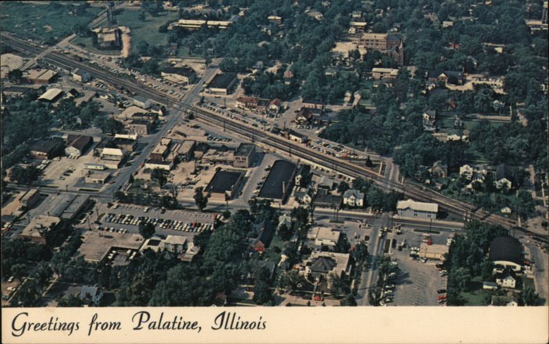 | An aerial view of Palatine, Illinois looking north. This Chrome-era postcard shows the town's layout, including streets, buildings, railroad tracks, and residential areas. The postcard notes that Palatine is located approximately 31 miles northwest of Chicago's Loop and had a population of about 20,000 at the time of printing. |