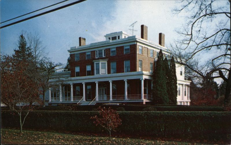 | Boxwood, a stately brick mansion located in Old Lyme, Connecticut. Built in 1842, the house features a prominent white portico with columns, and white window frames. The front yard is landscaped with a manicured hedge, evergreen trees, and smaller deciduous trees and shrubs. |