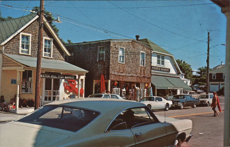 Front: ICE WATCH HILL FISH MARKET FIORE'S MARKET MING MEATS GROCERIES Back: Bay Street, Watch Hill, Rhode Island GAF Ansochrome Ⓡ Photo Copyright By B. L. Gordon Published By Book & Tackle Shop, Watch Hill, R.I. 0289 47140
