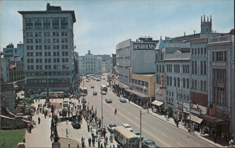 Front: DENHOLMS KRESOW KAY Rgation Back: MAIN STREET, WORCESTER, MASS. "The heart of the Commonwealth" Pub. by NATCO®, Natural Color Cards Co., Ridgefield Park, New Jersey 78707-B dp DEXTER PRESS, INC. WEST NYACK, NEW YORK HERE