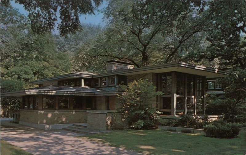 The Isabel Roberts House, River Forest, Illinois by Frank Lloyd Wright in 1908. A project of the Tourism Committee of the Oak Park River Forest Chamber of Commerce. 65221-C Pub. by MICHAEL WEST PHOTOGRAPHY, OAK PARK, ILL. 386-5800 HERE