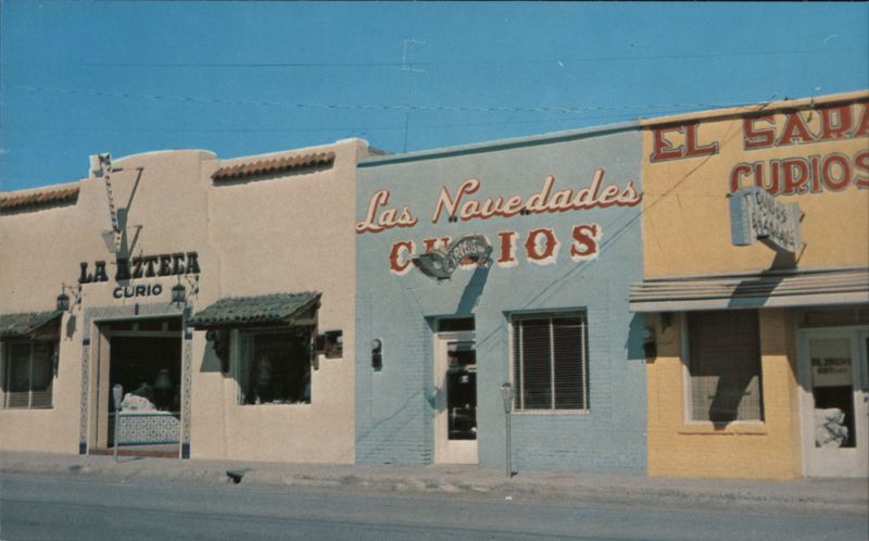 | Three adjacent curio shops on Route 66, each with distinct architectural styles and color schemes. The first, La Azteca Curio, is a cream-colored stucco building with a tiled awning and decorative ironwork. The central shop, Las Navedades Curios, features a light blue brick facade with red lettering. The third shop, El Sahara Curios, is painted yellow with a blue and red sign. Telephone wires crisscross the clear blue sky above. |