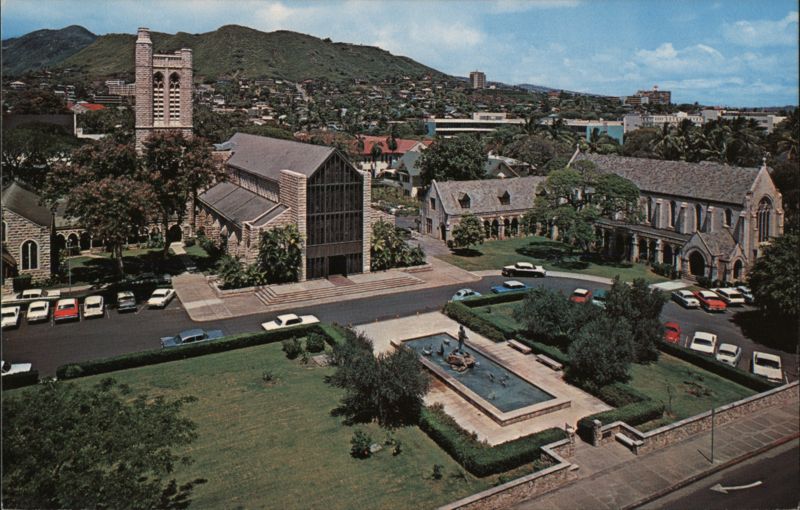 An aerial view of the Cathedral Church of St. Andrew in Honolulu, Hawaii. The cathedral's French Gothic architecture is evident, with its towering steeple and ornate details. The surrounding grounds are well-manicured, featuring a central fountain, trees, and parking areas. The backdrop includes a view of a nearby hill and some taller buildings in the distance. |