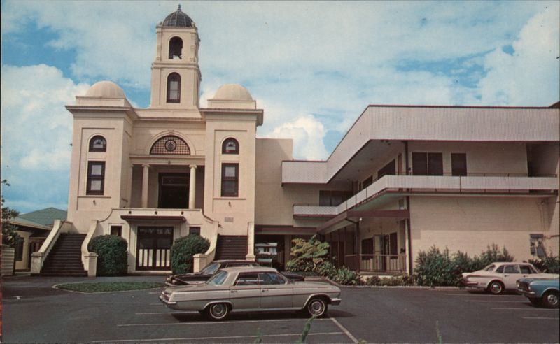 | A view of the Hilo Hongwanji Mission in Hilo, Hawaii. The postcard shows the mission's unique architecture, featuring a central tower with a domed top and a bell tower. A more modern addition is visible to the right of the main building. Several cars are parked in the lot in front. |