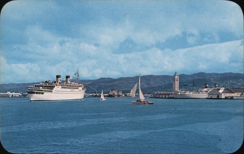 1019-Hawaiian Views, Dist. by Max Basker & Sons, Honolulu wwwy ALOHA TOWER, HONOLULU HARBOR ON BOAT DAY 9C-K1672 CURTEICHCOLOR Ⓡ 3-D NATURAL COLOR REPRODUCTION (REG. U. S. A. PAT. OFF.)