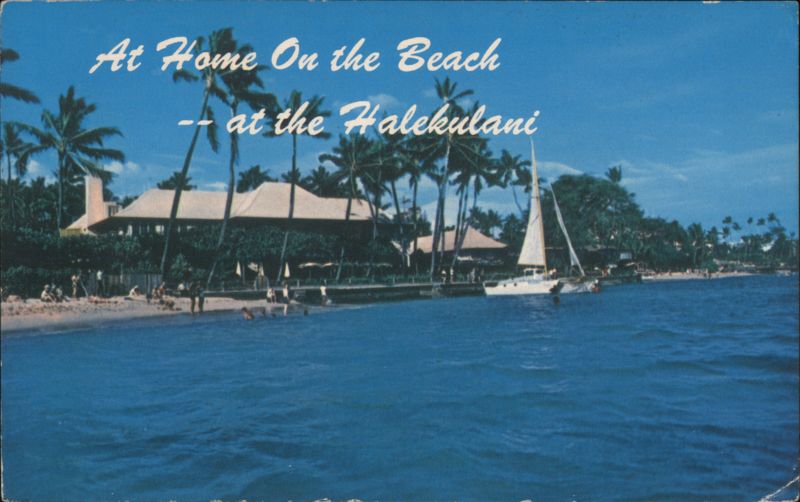 Front: At Home On the Beach at the Halekulani Back: THE HALEKULANI, Hawaii's traditional cottage hotel at the edge of Waikiki's sparkling blue waters. Published by Tongg Publishing Co., P.O. Box 2113, Honolulu, Hawaii 96805 300108