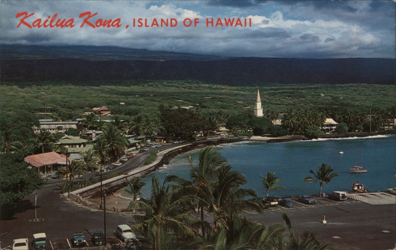 | An aerial view of Kailua Kona, a vibrant resort town on the Island of Hawaii, showcasing the charm of old Hawaii with its picturesque coastline, buildings, and church steeple. The lush greenery and palm trees add to the tropical ambiance, while parked cars and boats in the bay complete the scene. |
