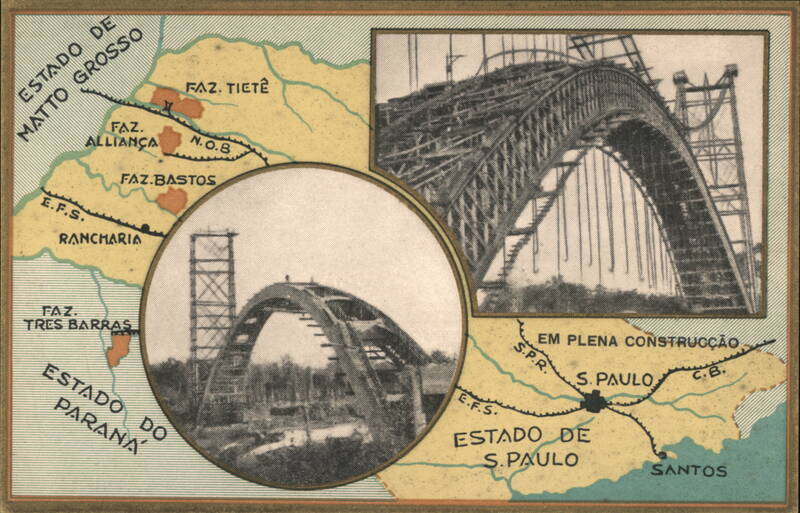 | Two views of the Tiete River bridge under construction. One image shows the bridge from a distance, while the other is a close-up of the arch construction. A map shows the bridge's location between the states of Mato Grosso and Paraná, near the border with São Paulo. |