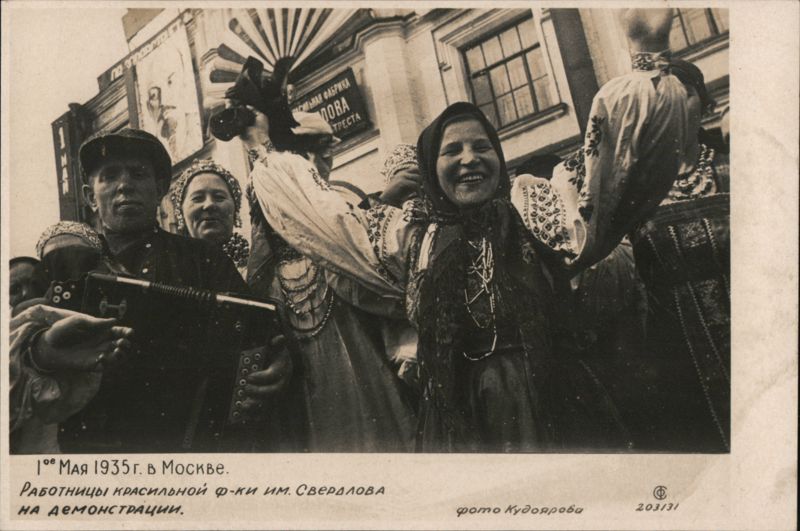 Front: па управст 19 Мая 1935 г. в Москве. РАБОТНИЦЫ КРАСИЛЬНОЙ ф-ки им. СВЕРДЛОВА НА ДЕМОНСТРАЦИИ. НАСИЛЬНАЯ ФАБРИКА MORA TPECTA фото Кудоярова 203131 Back: ПОЧТОВАЯ КАРТОЧКА Posta качto Copyright by Unto bird, Amsterdam and Sovfoto New York 8 фото