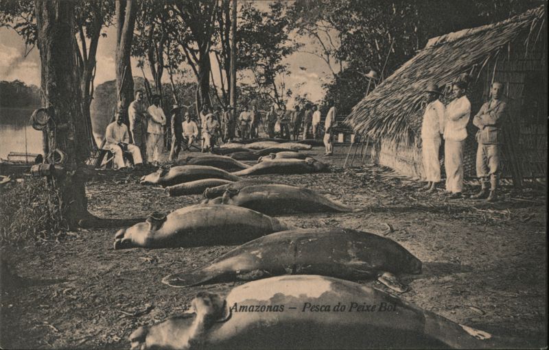 A group of fishermen stand proudly next to their catch of Amazonian manatees (Peixe Boi) laid out on the riverbank. A thatched hut is visible in the background.
