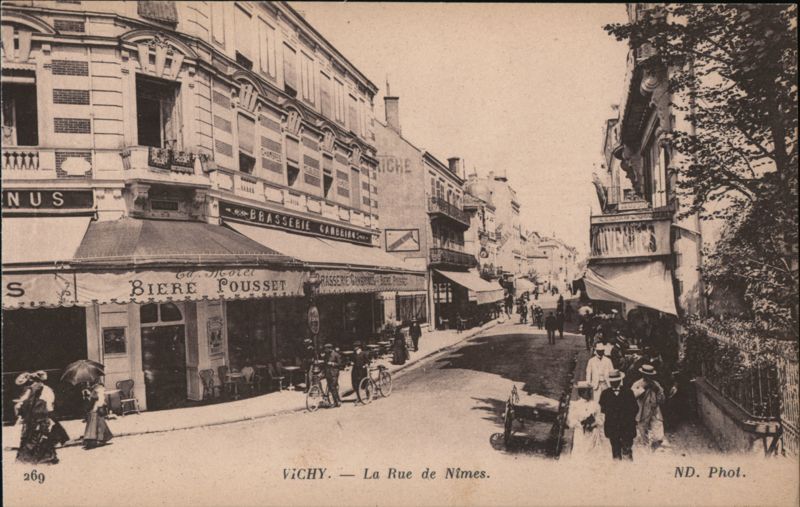 Front: **** NUS 269 Cascoret RICHE CHAMBRES BRASSERIE CANBEINS BIERE POUSSET BRASSERIE GANGRINES BERE PASSE ALAN GURBETY VICHY. La Rue de Nîmes. ND. Phot. Back: IMP. PHOT. NEURDEIN ET CIE. PARIS. Adresse