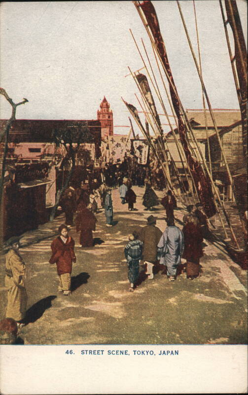 A bustling street scene in Tokyo, Japan, featuring numerous pedestrians in traditional and modern attire. Colorful banners hang from tall poles lining the street, and a prominent tower structure is visible in the background.
