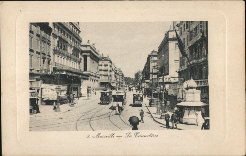 A bustling street scene on La Cannebière in Marseille, France. A tram is visible in the center of the street, with pedestrians and horse-drawn carriages also present. Buildings line both sides of the street, and a kiosk is visible on the right side of the image. |