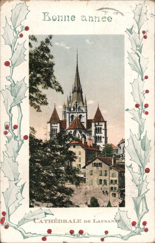 Front: Bonne année CATHÉDRALE DE LAUSANNE Back: LA 20X10 AUPA M. B. Brodbeck chaell. James Price à Driggs Idaho Etats-Unis. Cher contin Année et bonne Bonne et heureuse chance fo our fes lettre suits. amourettes. Elise 8839 Phototypie Co., Neuchâtel