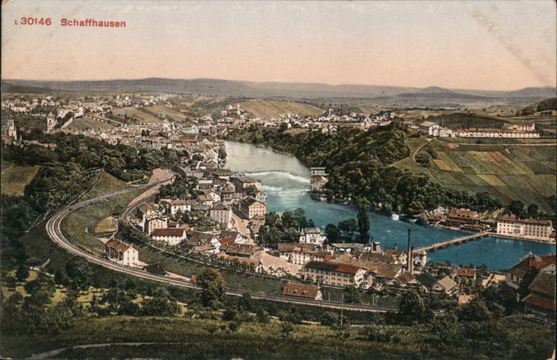 | A panoramic view of Schaffhausen, Switzerland, showcasing the Rhine Falls and the surrounding landscape. A railroad track curves through the foreground, leading the viewer's eye into the scene. The town is nestled along the river, with buildings clustered near the water's edge. Lush greenery and rolling hills frame the cityscape. |