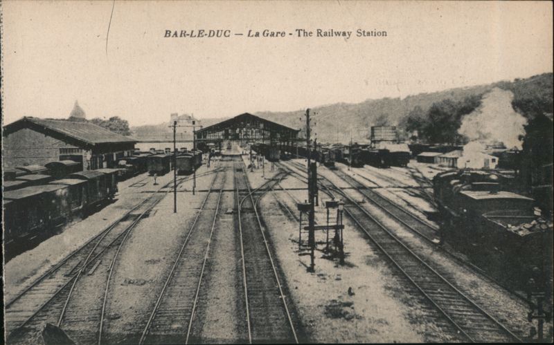 A view of the railway station at Bar-le-Duc. Several train cars are visible on the tracks.